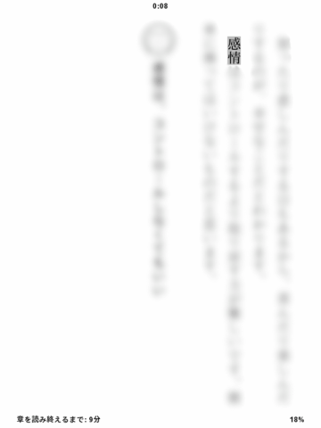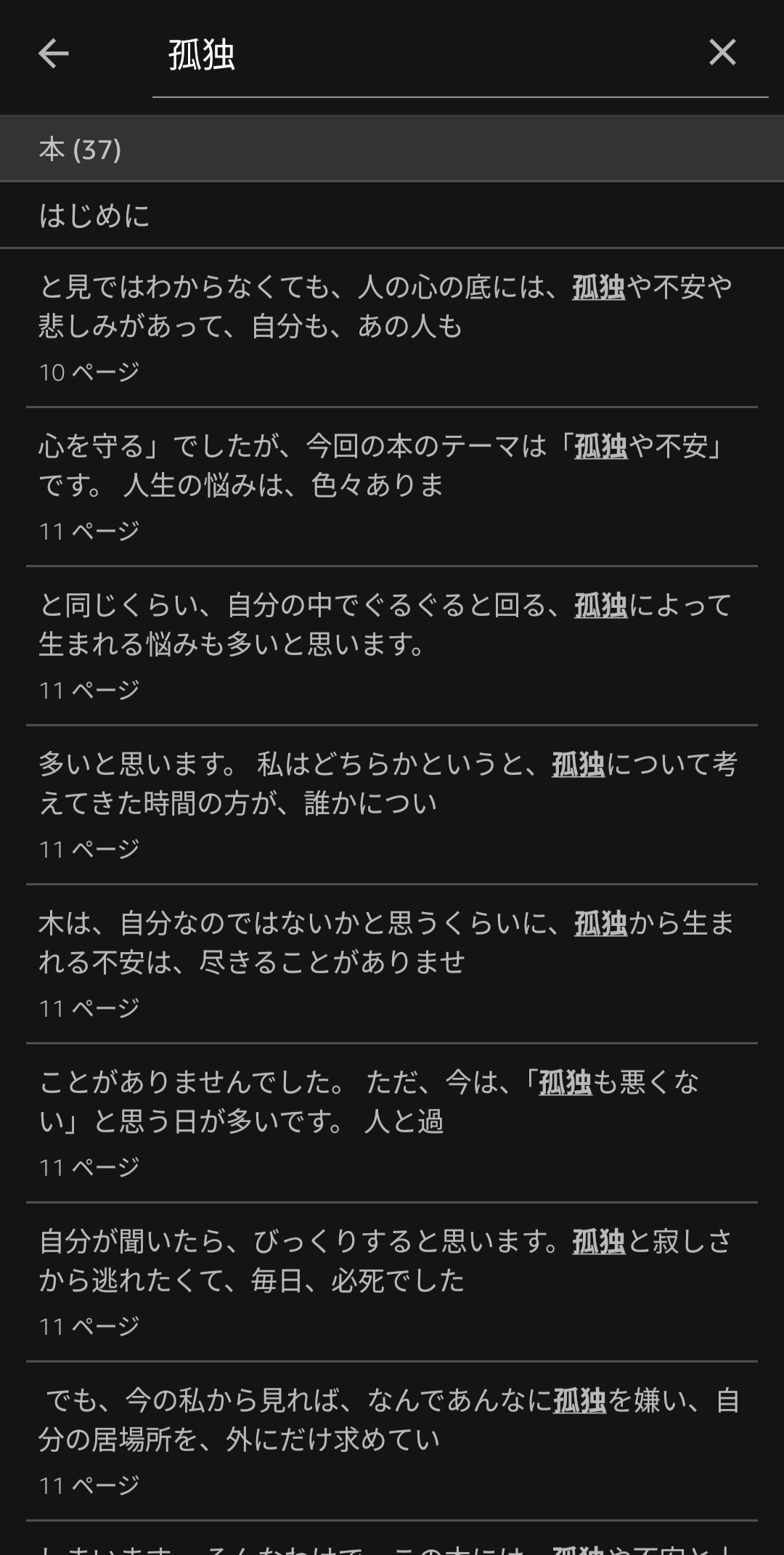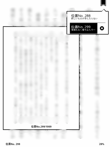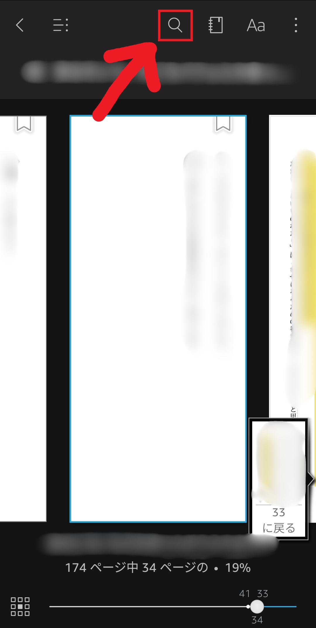 読書中に画面をタップしてメニューを開き、検索ボタン(虫眼鏡のマーク)をタップすると、特定のフレーズや単語がその本のどの部分に記載されているかを検索できます。小説の登場人物の登場箇所や有名なフレーズの引用元などを調べる際に大変便利な機能です。