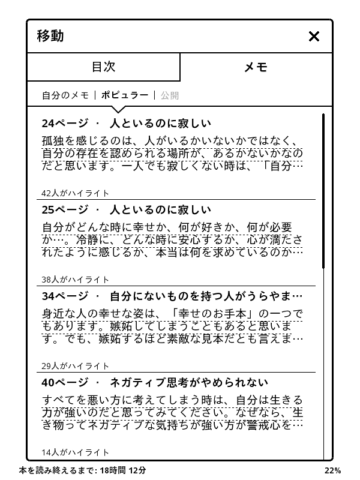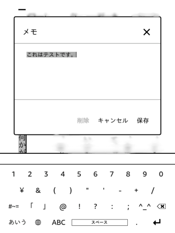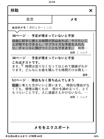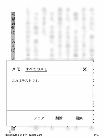 メモはマーカーと同じ方法で、読書中に画面をタップして表示されるメニューから確認可能です。