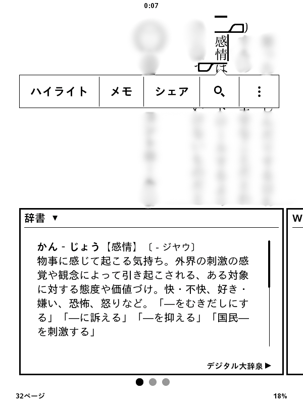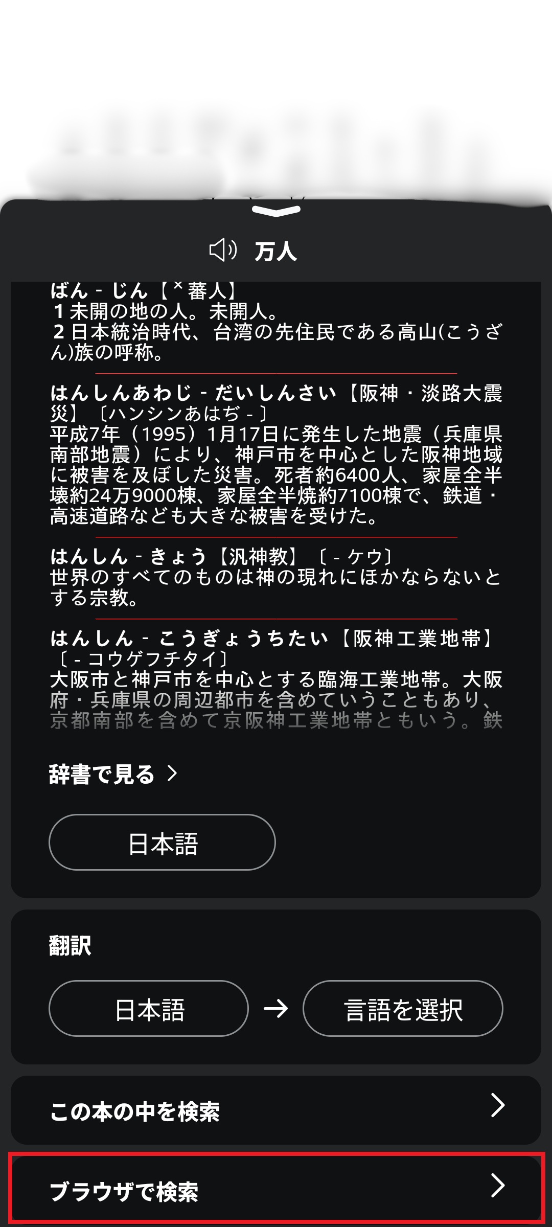 読書中にわからない単語があった場合、その場で意味を調べることができます。