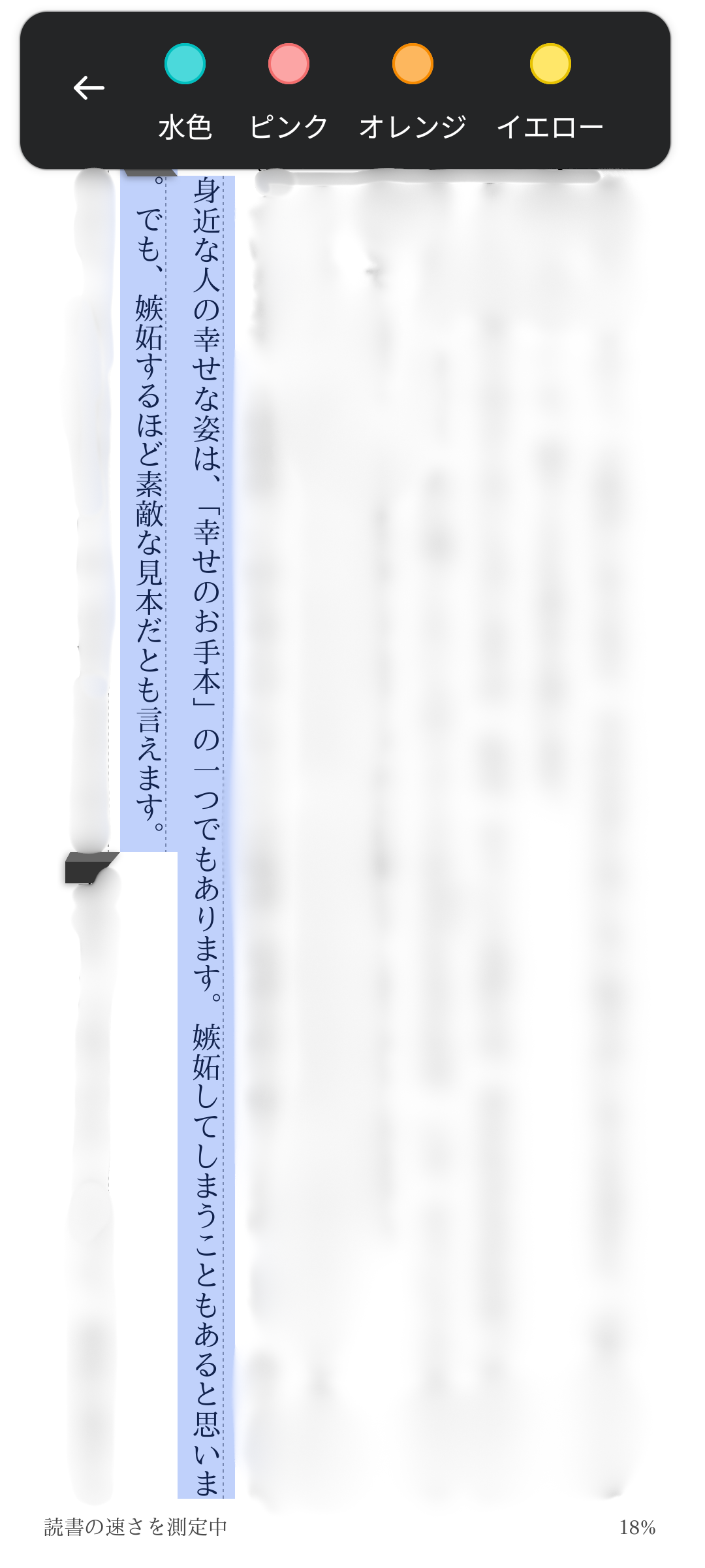文章を長押しするとメニューが開くので、色を選択するとマーカーが引かれます。