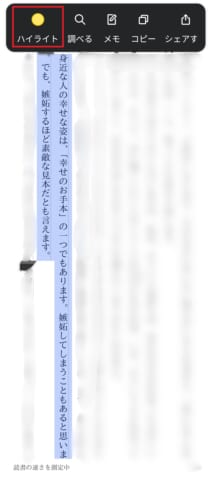 ▼文章を選択後に表示されたメニュー。「ハイライト」を選択する