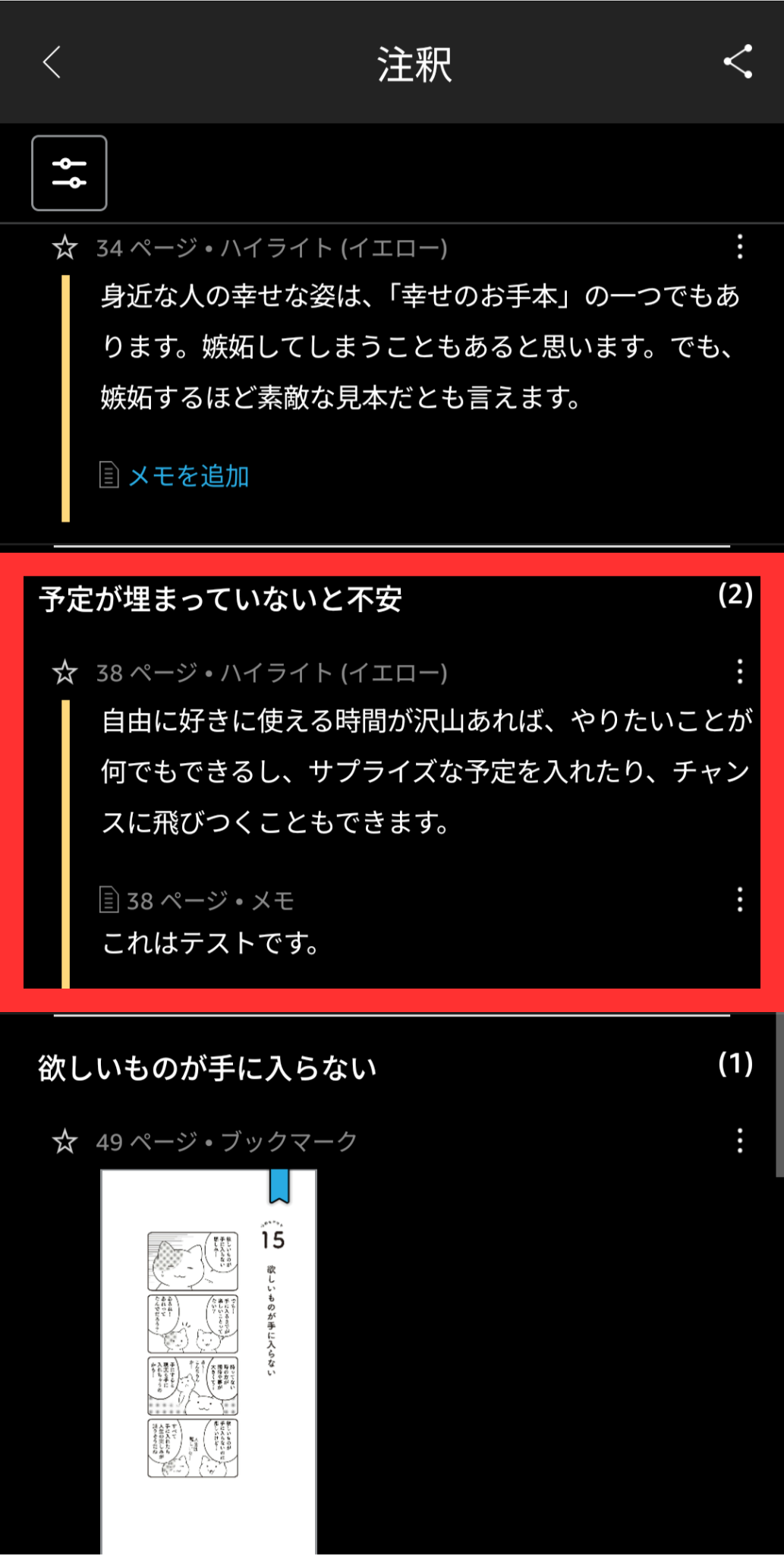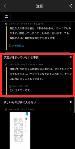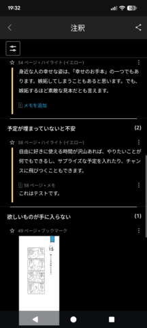 Kindle本を開いた状態で画面をタップし、メニューボタンから「注釈」を選択すると、当該のKindle本内でつけたマーカーが一覧で表示されます。