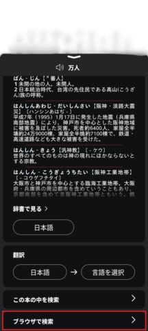 調べたい単語が辞書に記載されていない場合、Google検索やWikipedia、翻訳機能を利用できる場合もあります。翻訳は単語だけでなく文章にも対応しています。