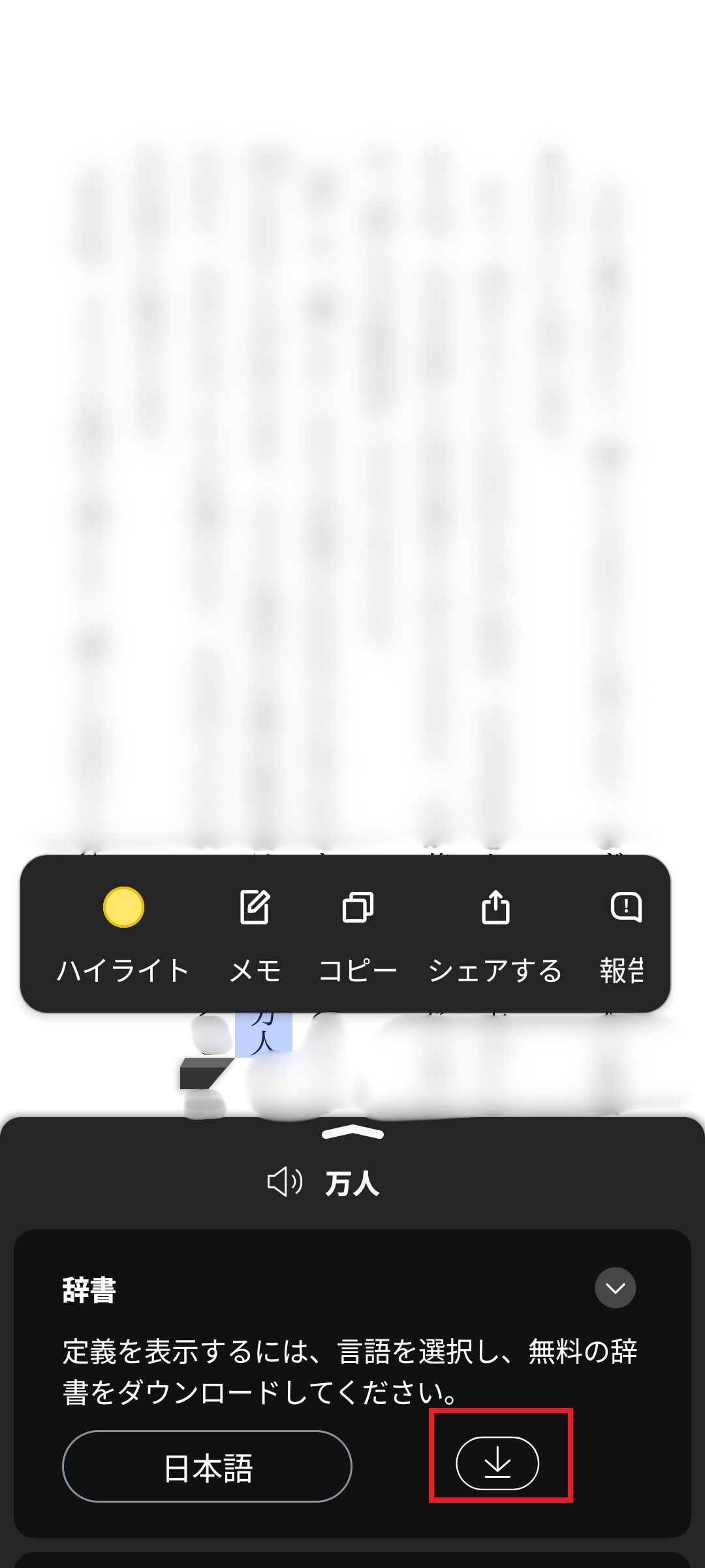 まだ辞書をダウンロードしていない場合は、矢印マーク「↓」をタップして辞書をダウンロードしてください。