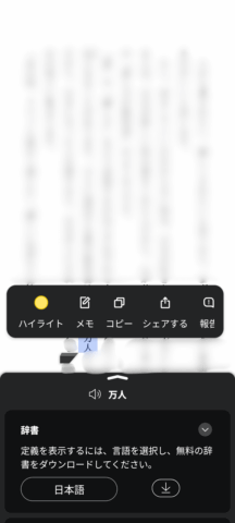 単語や文章を長押しタップすると、言葉の意味を調べられるメニューが表示されます。