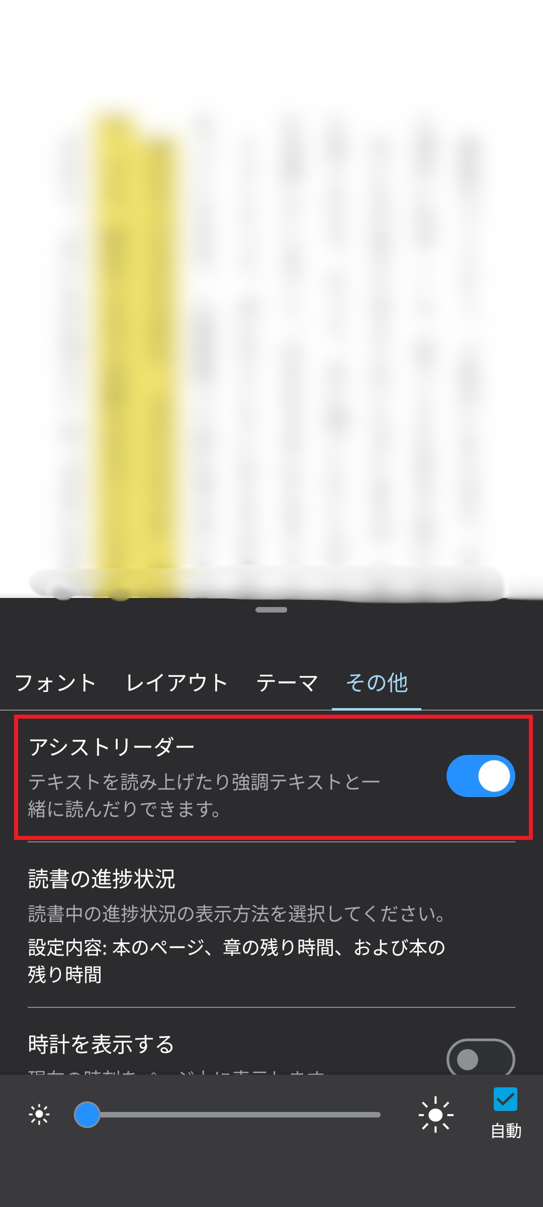 ▼「その他」のタブにあるアシストリーダーの設定。オンにすると読み上げができるようになる