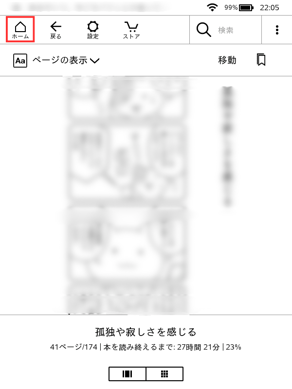 読書中に画面上部をタップしてメニューを表示し、一番左の家マークをタップするとホーム画面に戻ります。