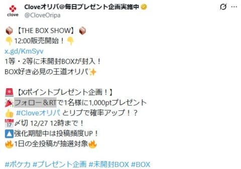 cloveオリパの公式Xでは、ポストをフォロー&RTをすると抽選でポイントが手に入るクーポンがもらえるキャンペーンを毎日開催しています。