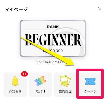 - マイページにある「クーポン」をタップ