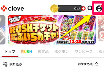 - Cloveオリパトップページの右上にある人型アイコンをタップして「マイページ」を開く