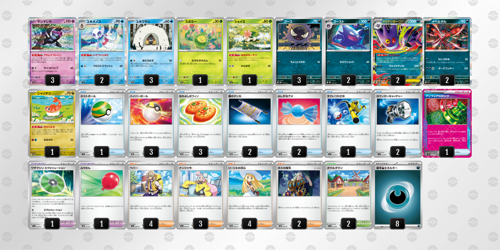 スボミーやイベルタルで相手をグッズロックしたり、縛りながら、アンフェアスタンプなどで時間を稼ぎをして回していく構築になっております。