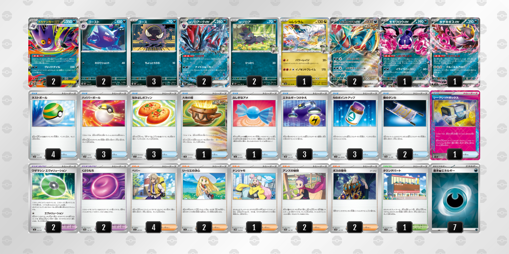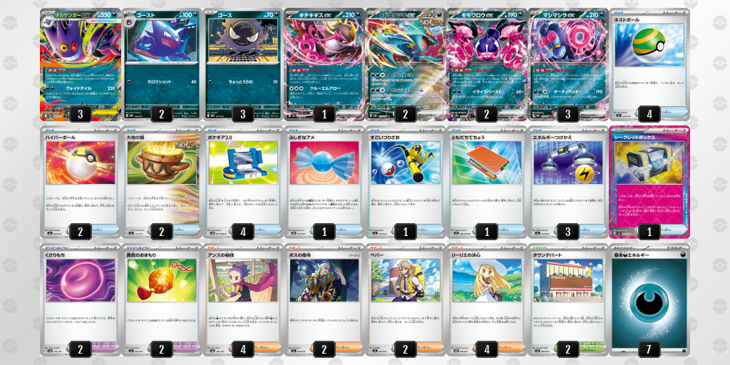 マリィのオーロンゲの特性でエネルギーがつくのでエネルギーの心配はなく終盤にはMEGAゲンガーも戦える構築になってます。2進化×2種なので、シークレットボックスで安定するように組んでいます。