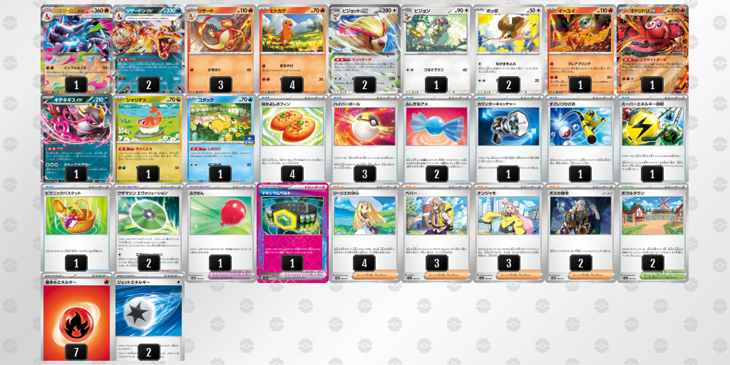 メガリザードンXexをピン刺ししたピジョット型のふしぎなアメを共用できるデッキ構築です。