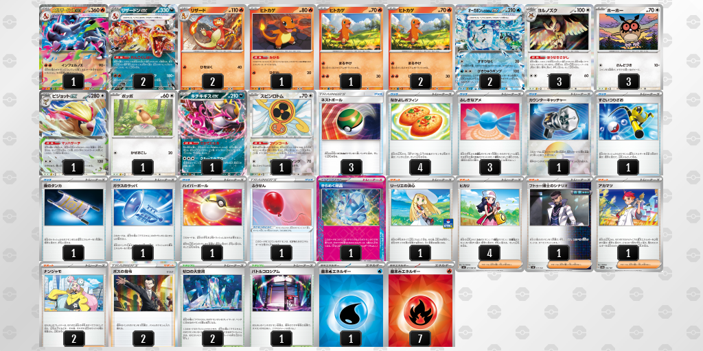 ヨルノズク採用型の宝石リザードンデッキです。きらめく結晶、アカマツを採用することでオーガポンいどのめんexのげきりゅうポンプが素早く起動できます。