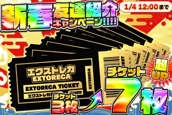エクストレカでは1月4日(日)12:00までの期間限定で、友達招待時に両方がもらえるチケットが3枚から7枚に増加するキャンペーンも実施中です。