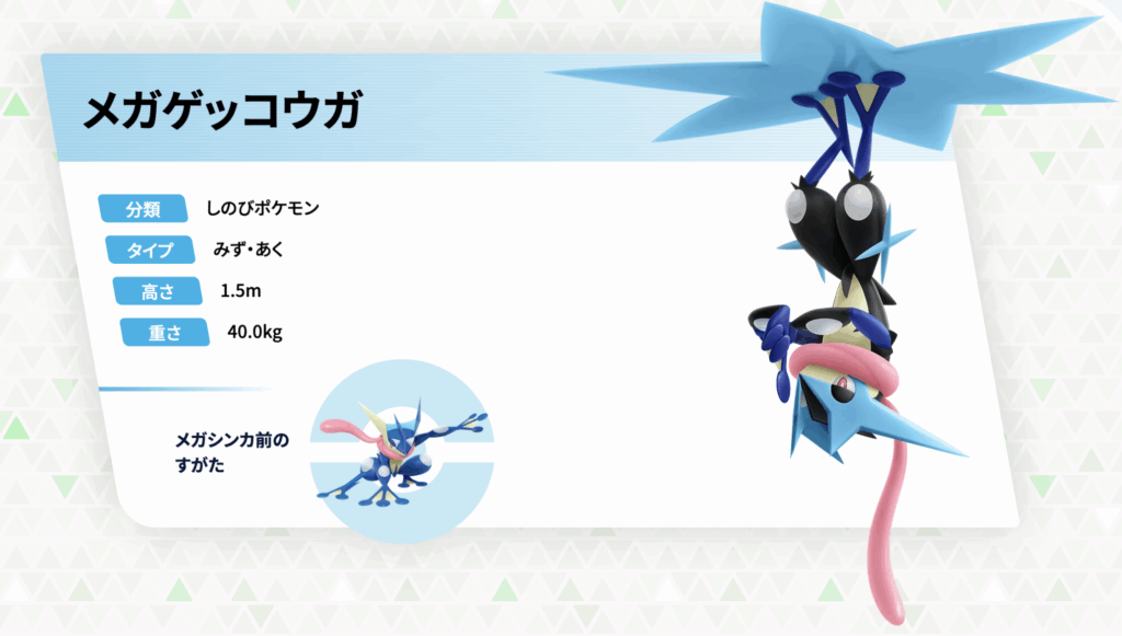 またメガゲッコウガexは、『Pokémon LEGENDS Z-A』にも登場するポケモンです。巨大な水手裏剣に逆さまに貼り付き、相手を驚かせてから水手裏剣を高速で回転させ攻撃するという、特徴的なバトルスタイルを持っています。