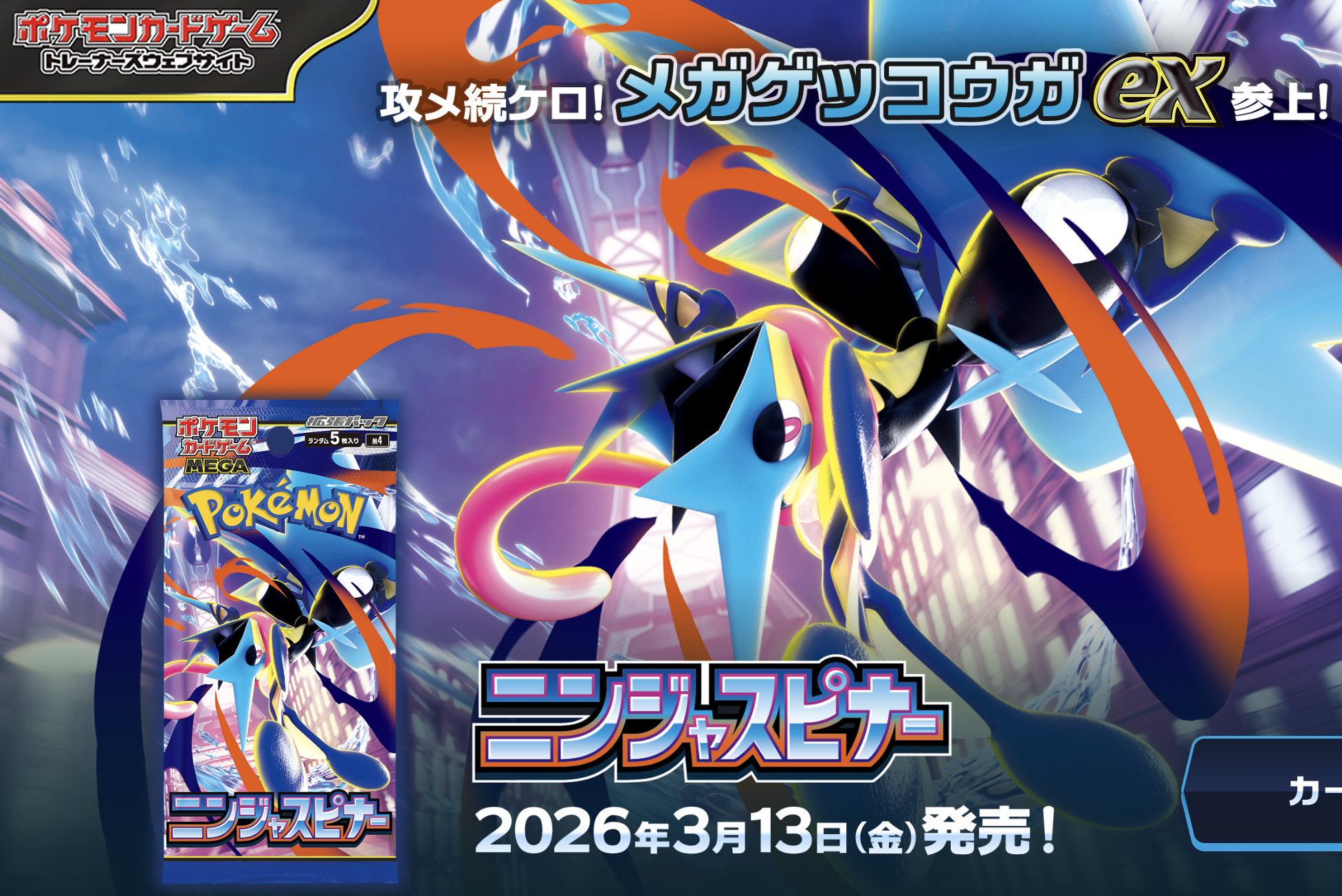 「メガゲッコウガex SAR」は2026年3月13日(金)発売の、「ニンジャスピナー」に収録される強力なカードです。イラストはスカーレット&バイオレット 拡張パック「バトルパートナーズ」にて SAR「リーリエのピッピex」などを手掛けているSusumu Maeya(前屋 進)さんです。
