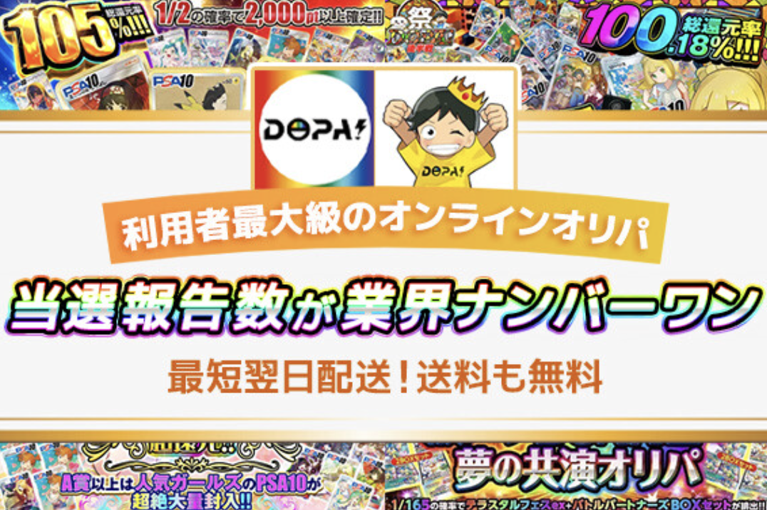 また大当たりを引ける可能性と、ハズレてもそれなりにリターンがある安心感を兼ね備えた優良サイトです。安心して遊べる環境と、お得なキャンペーンが揃っているのがDOPAオリパの魅力です。