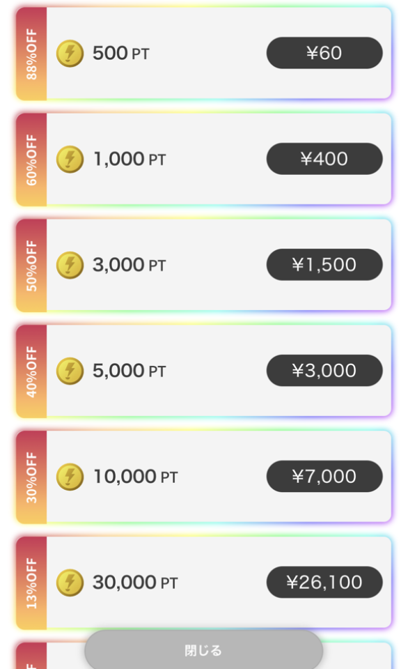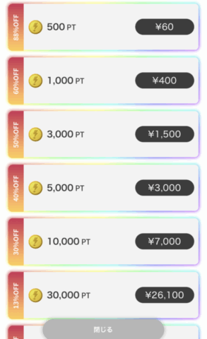 - トップページの上にある「+」をタップし、課金したい額を決めてPTをチャージする
