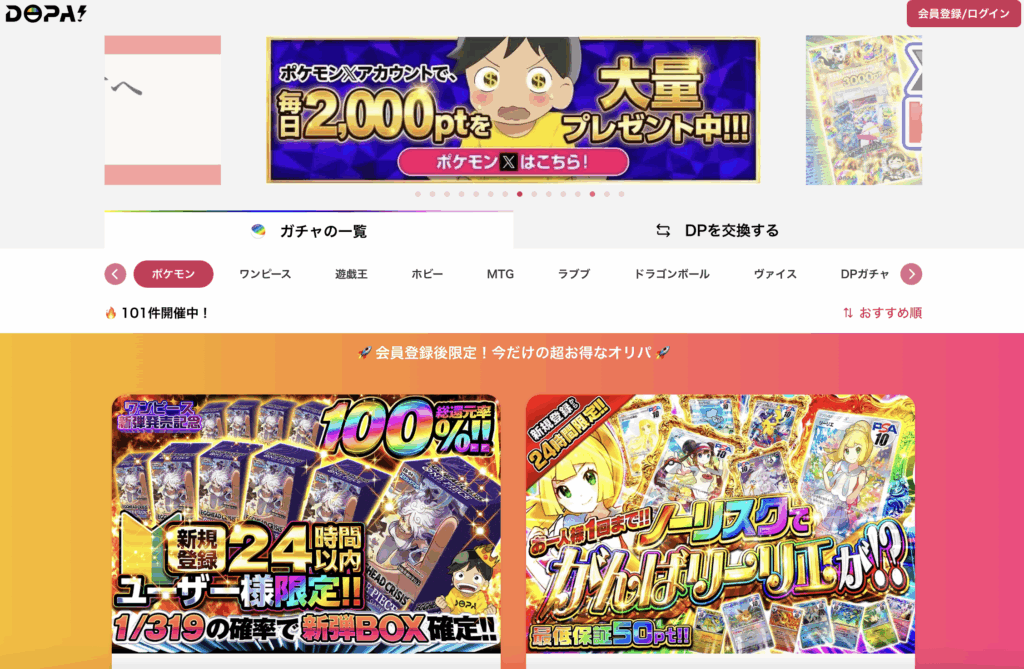 オリパの種類や価格帯も様々なので自分に合ったオリパを探しやすく、ガチャ演出も楽しめます。