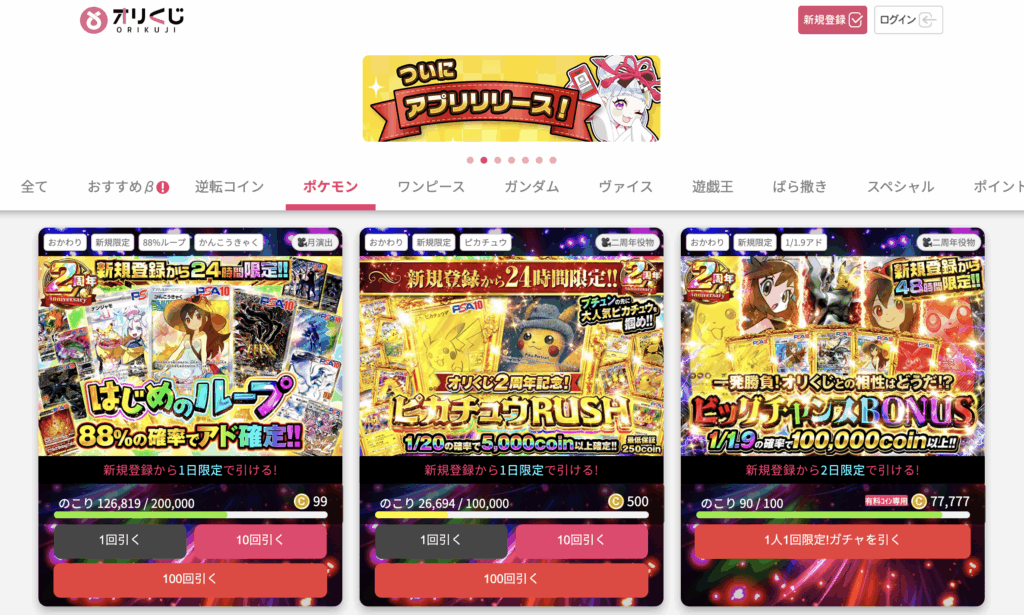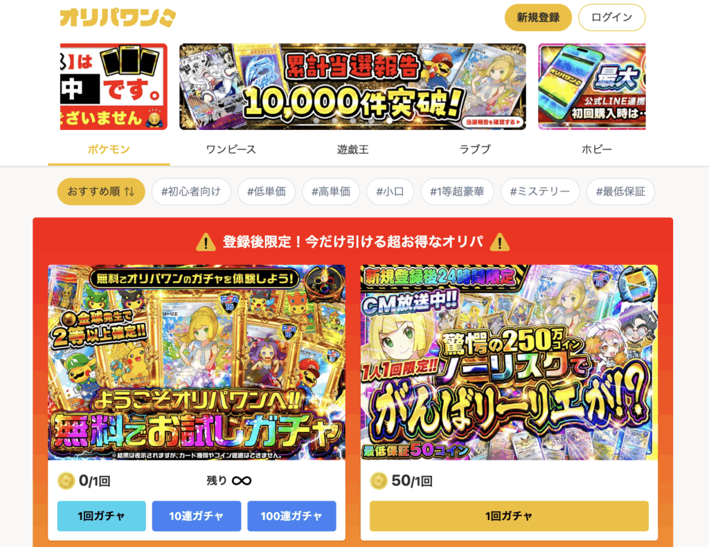POCHIORIPA(ポチオリパ)は2023年12月にサービスを開始したオリパサイトで、口数が少なめなのでラストワン賞も狙いやすいです。