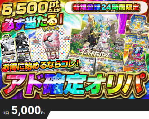 アド確定オリパは、新規登録者のみ24時間以内に1回限り引くことができるオリパです。