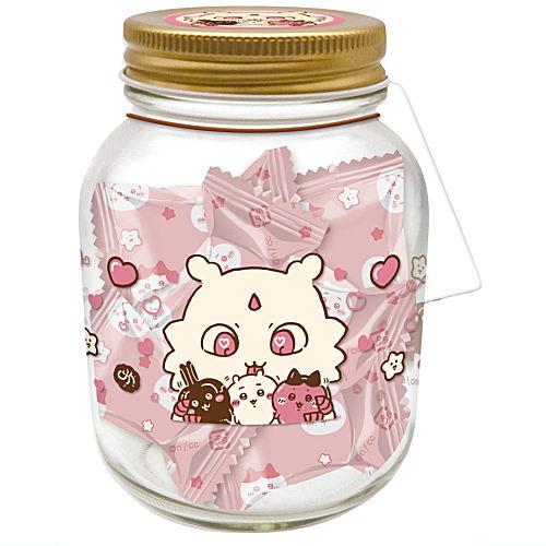 ガラスボトルに入ったソフトチョコレート6個。食べ終わった後は小物入れとして使用可能。ちいかわたちがチョコレートになり、「あのこ」に食べられそうな可愛らしいイラストが描かれています。