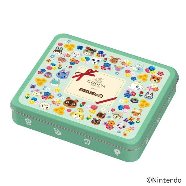 『どうぶつの森』の人気キャラクター(しずえ、つぶきち&まめきちなど)や、ゲーム内アイテム(葉っぱや花)をモチーフにしたチョコレートが詰め合わせられています。