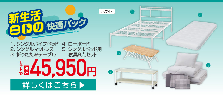 ニトリの家具やインテリアをセット購入可能。ベッド・寝具、机・収納家具なども特別価格で販売中。