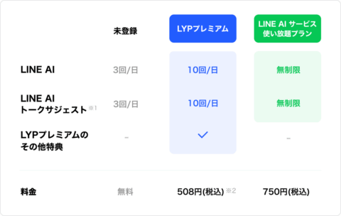- LYPプレミアム会員: 既存の特典に加え、「LINE AI」「LINE AI トークサジェスト」を1日あたりそれぞれ10回まで利用できます。LYPプレミアムの月額料金は508円(税込)から。