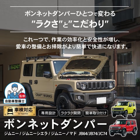 片手で簡単にボンネットの開閉が可能な油圧サポート機能付きボンネットダンパーです。ジムニー専用設計によりピッタリフィットし、手の挟まり防止やエンジンルームの作業性向上に寄与します。
