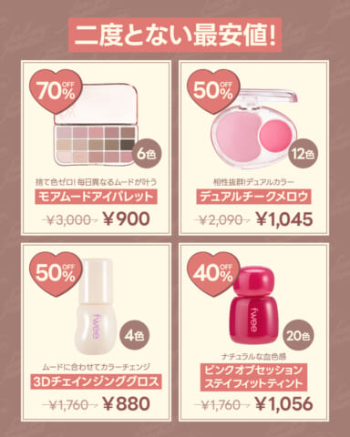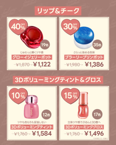 リップアンドチークやチークパレットもお得な価格で提供されます。