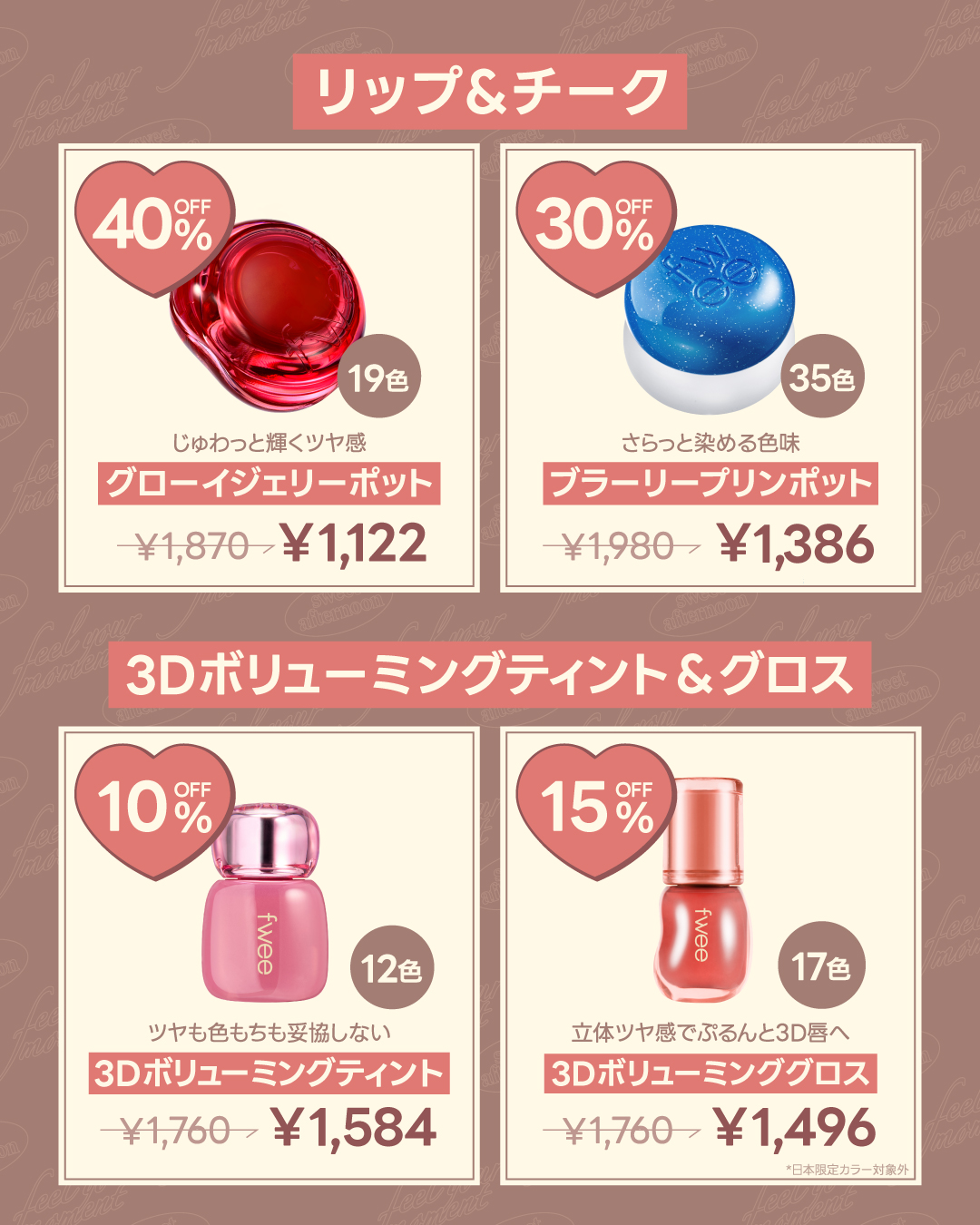 リップグロスやティント、リップセラムなど、fweeのリップ製品も多数セール対象です。