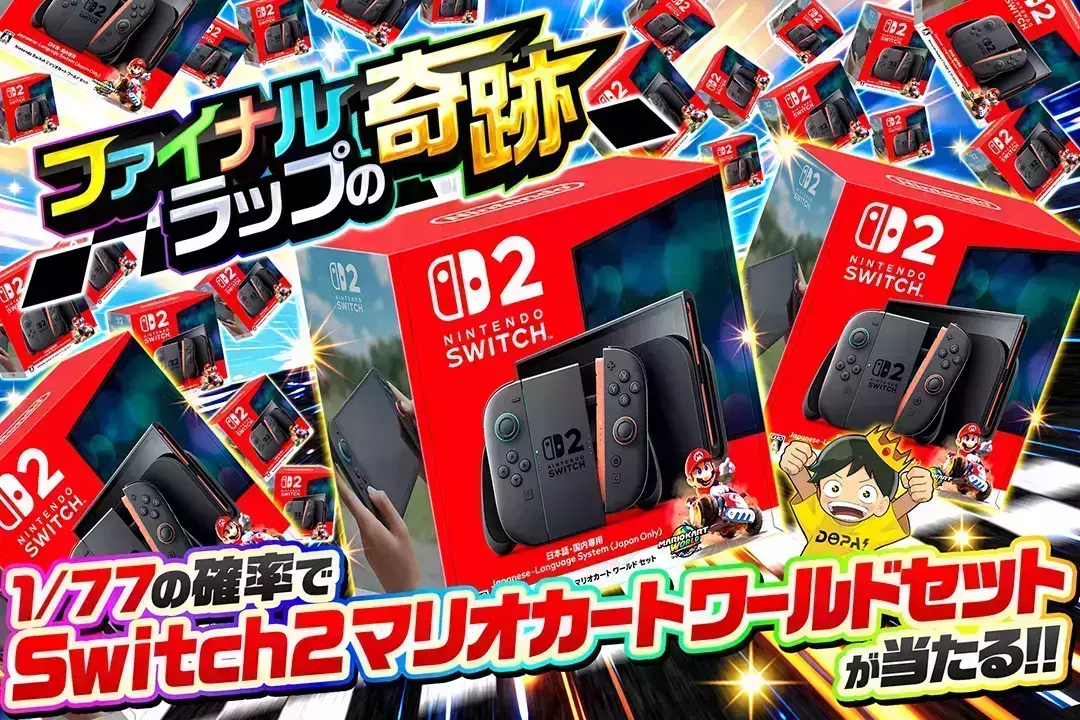 Switch2が景品の目玉となるガチャを頻繁に開催しています。「1/319の確率でSwitch2が当たる!!」と銘打ったオリパや、「1/77」や「1/10」といった確率でSwitch2を狙える超限定ガチャも登場しています。実際に「Switch2マリオカートセット」を当てたとの当選報告もSNSに多数あり、Switch2はDOPAの人気キャンペーンの一つとなっています。
