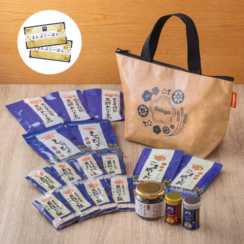 「まんぷく袋」には、大戸屋の味をご家庭で楽しめるオリジナル商品と、お得な「まんぷくーぽん」が合計5,250円相当のアイテムとともに含まれています。