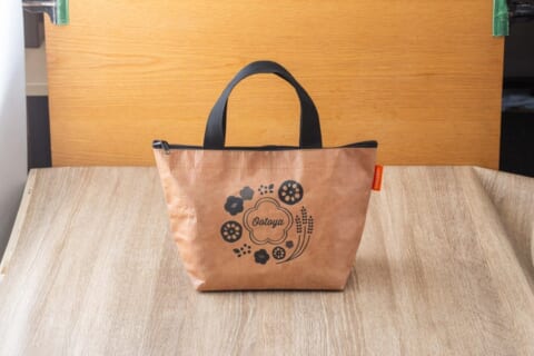 今回の福袋のために、株式会社オンワードコーポレートデザインが製作した大戸屋オリジナルお弁当バッグは、米袋をイメージしたクラフト調のデザインが特徴です。普段使いに適したサイズ感と、大戸屋の人気商品をイメージした稲やレンコン、お正月らしいお花をモチーフにしたオリジナルロゴが施されています。