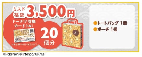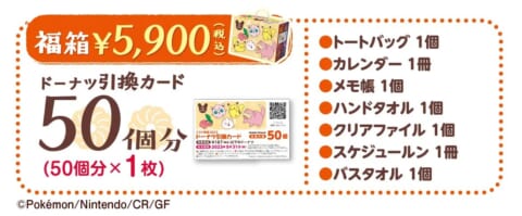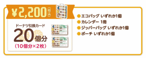 - 2024年福袋の例:2,400円(ドーナツ引換カード20個分)/ 3,600円(30個分)/ 5,900円(50個分)、対象ドーナツは187円以下。