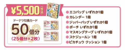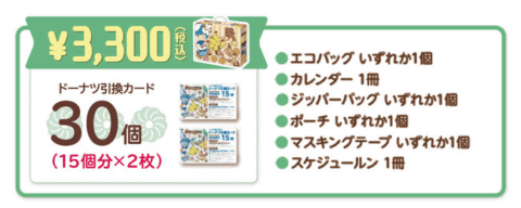 昨年より価格帯が引き上げられており、それぞれドーナツ引換券とグッズがセットになっています。