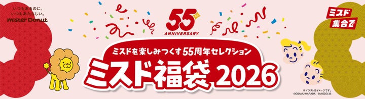 ミスタードーナツは、2026年の幕開けを彩る『ミスド福袋2026』を数量限定で展開します。お客様への感謝を込めた“ミスドを楽しみつくす55周年セレクション”をテーマに、特別感あふれるアイテムを揃えました。