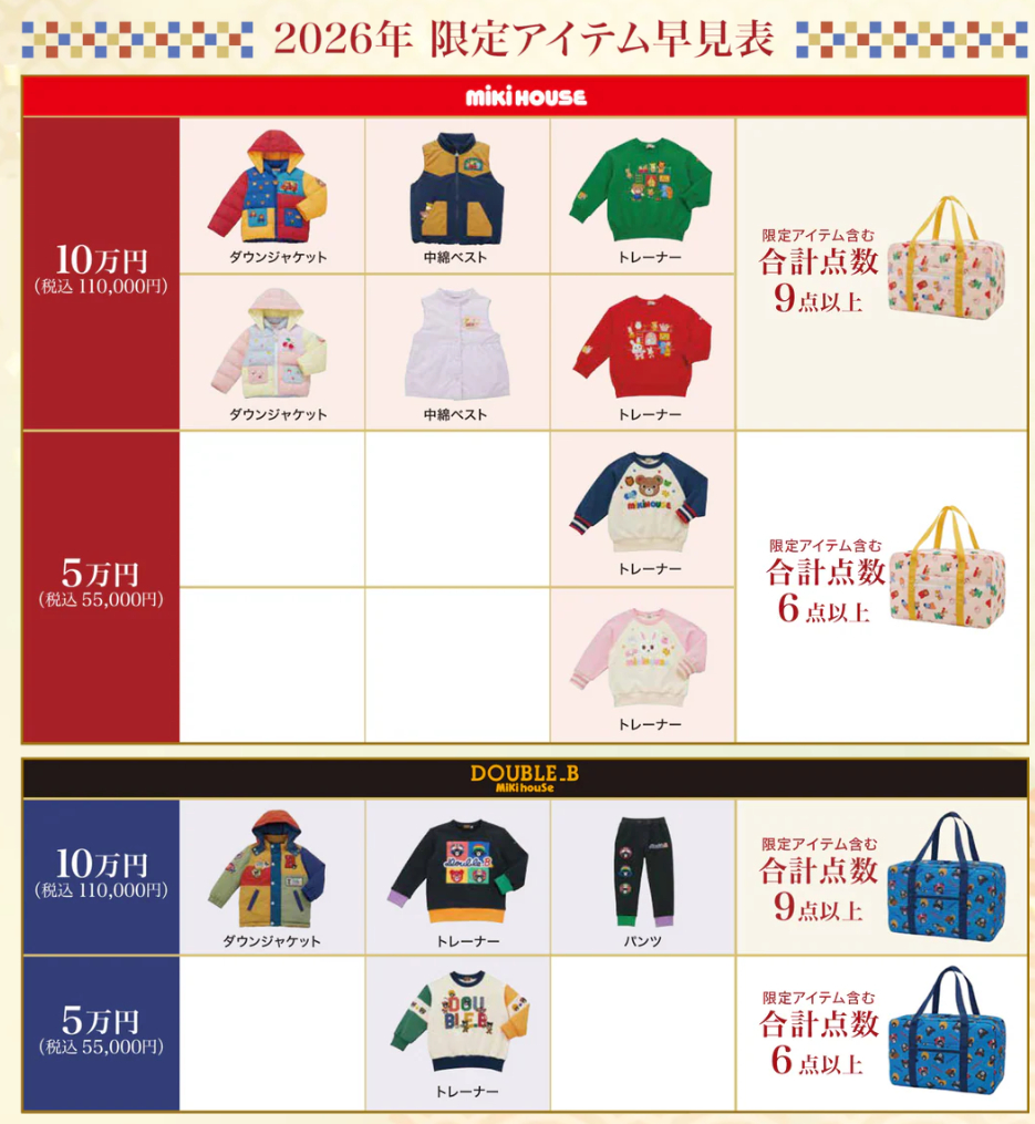 ミキハウスおよびダブルBから、110,000円(税込)の福袋が登場します。
