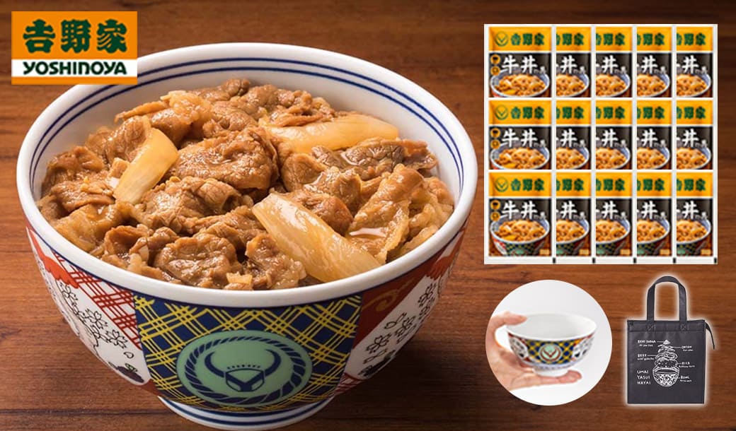 吉野家 牛丼の具お楽しみセットは、牛丼の具120gが15袋に、吉野家オリジナルお茶碗と保冷バッグがセットになった、限定60個の商品です。まとめ配送に対応しています。