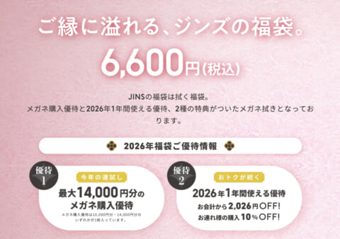JINSは2026年福袋の予約受付を2025年11月6日(木)10時より開始しました。販売価格6,600円(税込)で、最大14,000円分のメガネ購入優待券と1年間使える優待券の2種の特典が付いた「拭く福袋」として登場。開催内容や参加方法を詳しく紹介しますので、ぜひ参考にしてください。