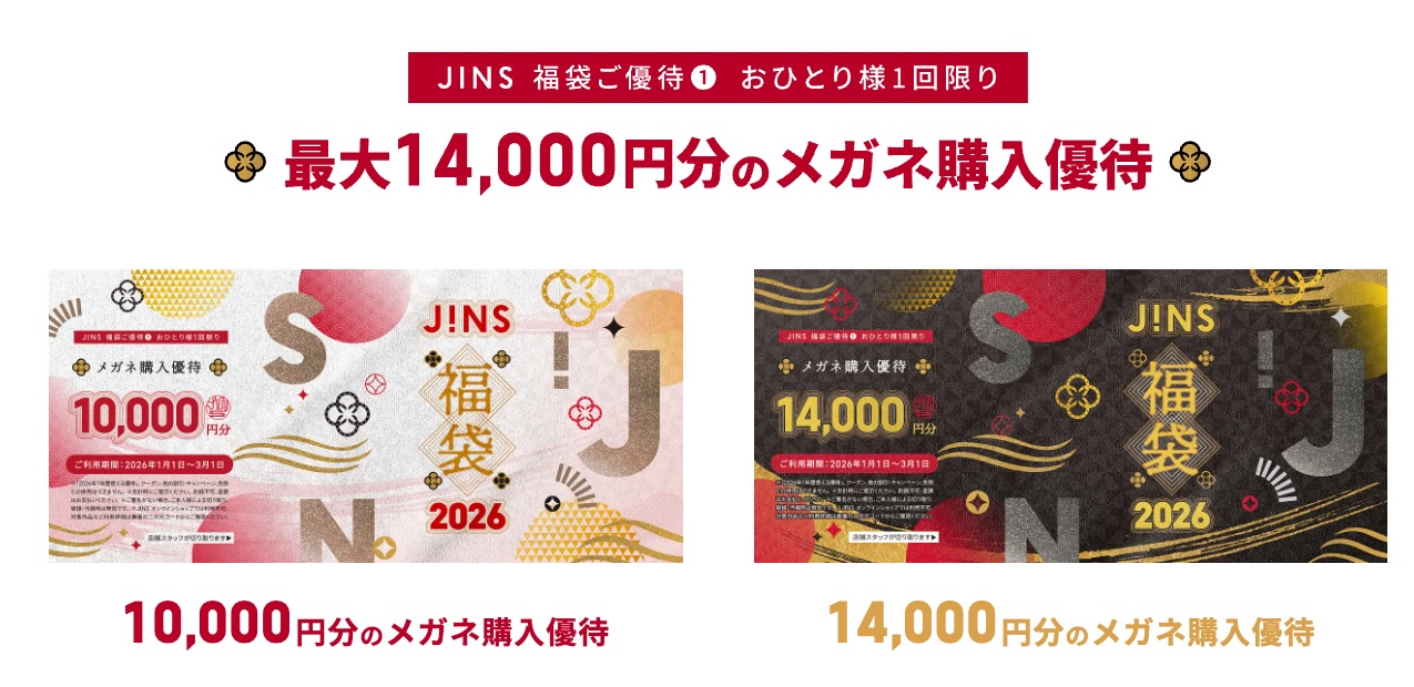 封入されるメガネ購入優待券の金額差を指します。JINS福袋では運試し要素として額面の異なるメガネ券(高額の「大当たり」か通常額の「当たり」)がランダムで1枚入っているのが特徴です。違いは単純にメガネ購入時に使える金額が多いか少ないかで、当たりの14,000円券ならより高価格なフレームも自己負担なく選べるメリットがあります。ただしどちらが入っていても最低額でも福袋代金以上の価値があるため「ハズレでも損はしない」と評判です。年間優待(2026円OFFや10%OFF)は大当たり/当たりに関係なく同じものが付属します。