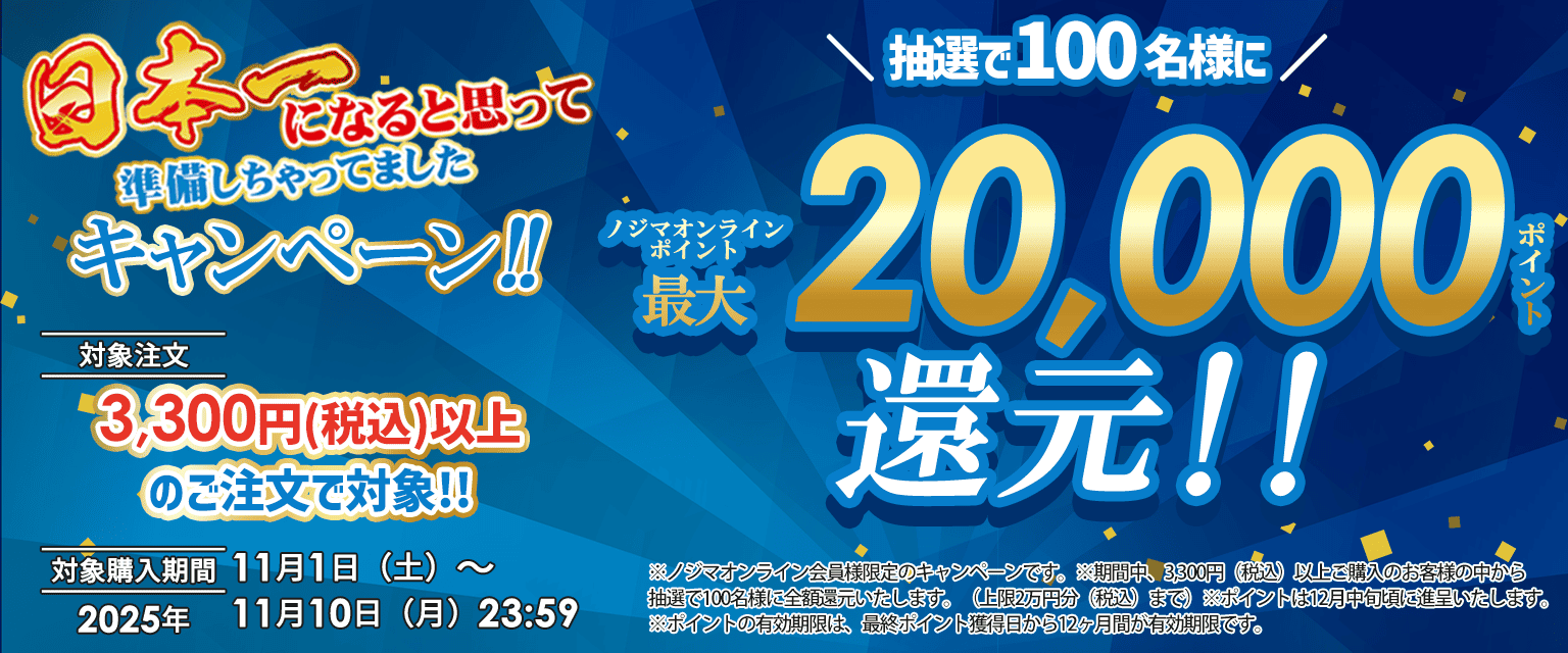 ノジマオンラインでは、2025年11月1日(土)より「日本一になると思って準備しちゃってました」キャンペーンを開催しています。本キャンペーンでは、対象期間中に3,300円(税込)以上購入された方の中から抽選で100名様に、お買い上げ合計金額が最大2万円相当のノジマオンラインポイントで全額還元されます。開催内容や参加方法を詳しく紹介するのでぜひ参考にしてください。