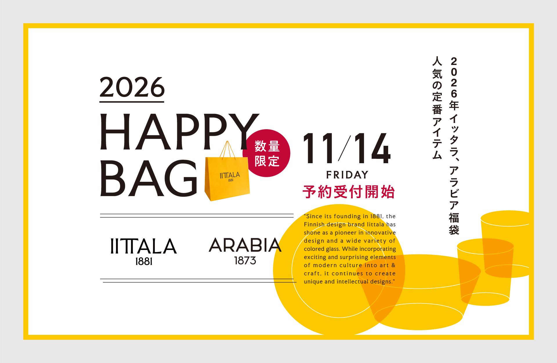 オンラインショップでは、イッタラ福袋3種とアラビア福袋2種の先行予約販売が実施されます。