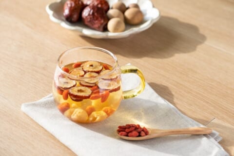 「なつめ」「クコの実」「ろんがん」という3種類の素材がブレンドされており、体の巡りをサポートするノンカフェインのお茶です。飲み終わった後の果実も楽しめます。