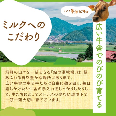 牧成舎は、自社牧場「鮎の瀬牧場」で珍しいジャージー牛を飼育しています。乳脂肪の高いジャージーミルクと飛騨の酪農家さんのミルクを混ぜて使用することで、コクがありながらも美味しいミルクを提供しています。