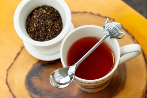 1. ティースプーン1杯(3~4g)分の茶葉を茶こしに入れる。 2. お湯200mlを注ぐ(カップの6分目程度まで)。 3. ふたをして5分待つ。 4. 完成。 |