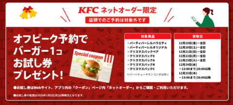 ケンタッキーでは、混雑を避けた「オフピーク予約」をKFCネットオーダー限定で実施しています。これにより、スムーズな商品受け取りだけでなく、特典も得られます。