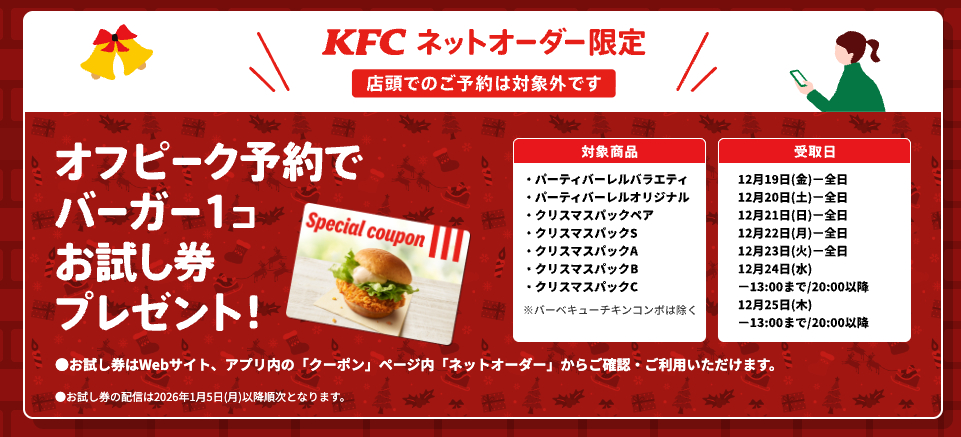 KFCネットオーダー限定 Webサイトまたはアプリ内の「クーポンページ」>「ネットオーダー」にて、2026年1月5日以降順次配信されます。 |